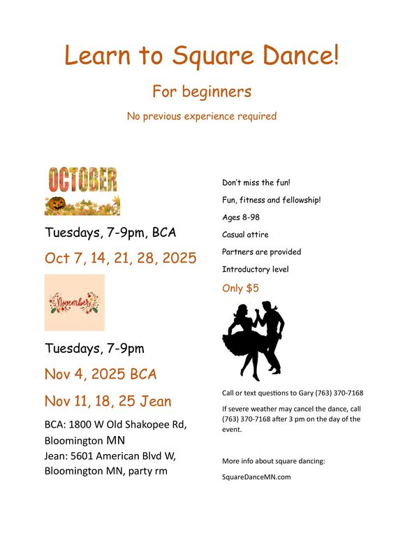 For general information, call Gary at (763) 370-7168. If weather on the day of the dance is questionable, call (763) 370-7168 after 3 pm on the day of the event. If we're canceling, the voicemail message will say so. Otherwise, we're on!