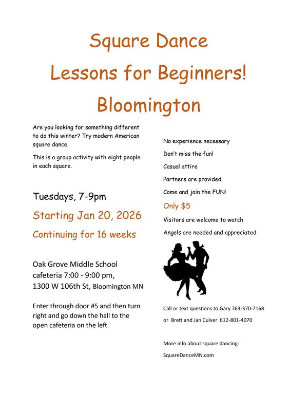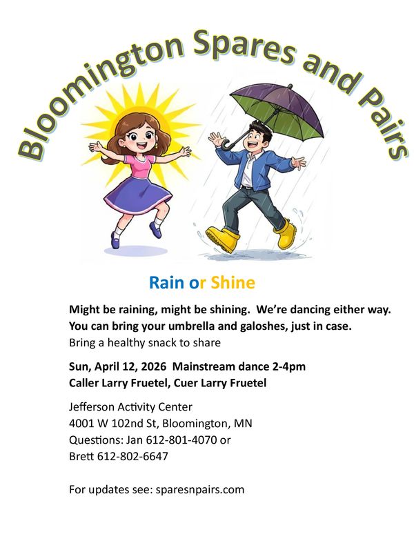 Spares and Pairs dances are the second Sunday of the month. Mainstream dance 2-4pm. Come see our new location at the Jefferson Activity Center - Dance Studio - 4001 W 102nd St, Bloomington, MN