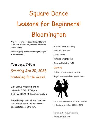 Spares and Pairs dances are moving to the second Sunday of the month starting Sunday, January 11th. Mainstream dance 2-4pm. Come see our new location at the Jefferson Activity Center - Dance Studio - 4001 W 102nd St, Bloomington, MN
