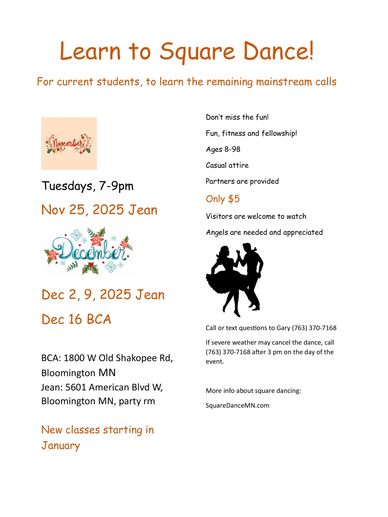 Spares and Pairs dances Mainstream on the second Wednesday of each month, through December. The December dance is the Bloomington Center for the Arts, 1800 West Old Shakopee Road, Bloomington, Minnesota. Parking on east side of the building is closer to the room in which we dance. Our Dance Listings page gives you all the details.