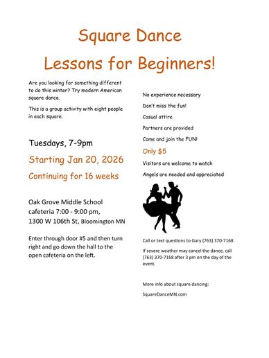 For general information, call Gary at (763) 370-7168. If weather on the day of the dance is questionable, call (763) 370-7168 after 3 pm on the day of the event. If we're canceling, the voicemail message will say so. Otherwise, we're on!