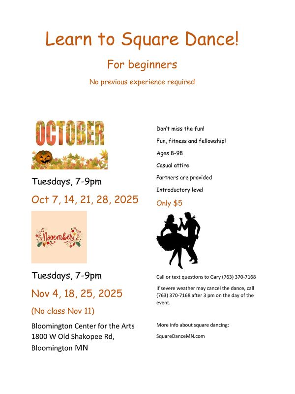 We are at the Bloomington Center for the Arts, 1800 West Old Shakopee Road, Bloomington, Minnesota. Parking on east side of the building is closer to the room in which we dance.