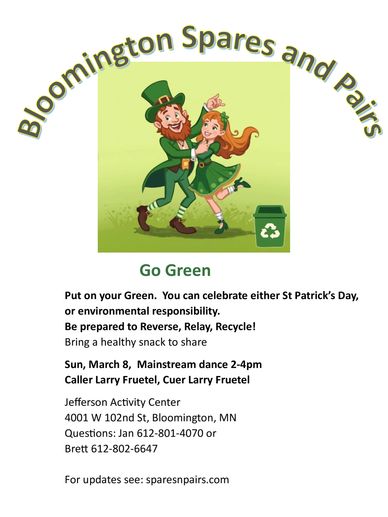 Spares and Pairs dances are moving to the second Sunday of the month starting Sunday, January 11th. Mainstream dance 2-4pm. Come see our new location at the Jefferson Activity Center - Dance Studio - 4001 W 102nd St, Bloomington, MN